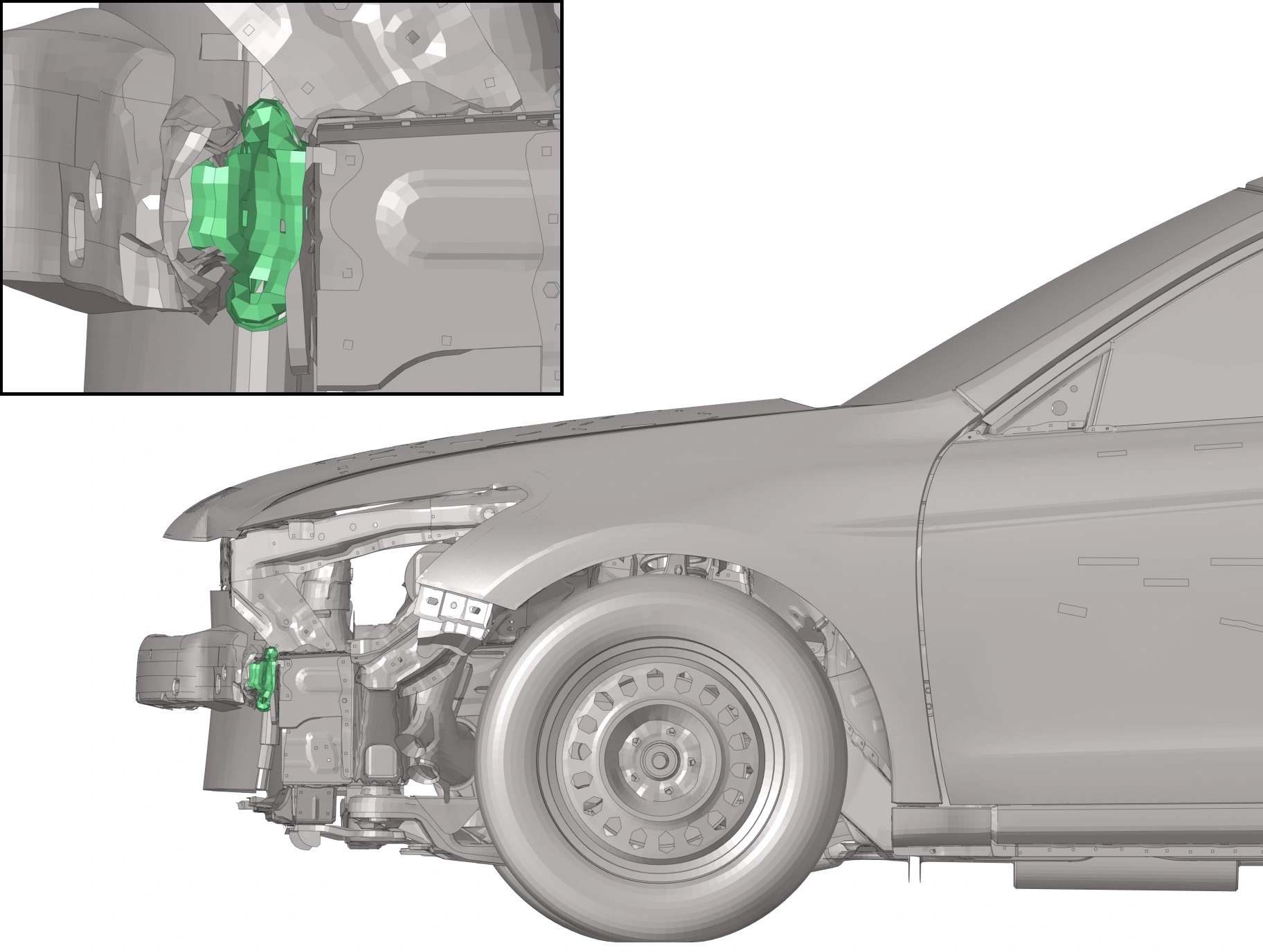 The crash box of the Honda Accord model (Source: LS-DYNA model – National Highway Traffic Safety Administration NHTSA) is made of two sheets of metal welded together. Its purpose is to absorb all the kinetic energy for this scenario. The energy to be absorbed depends on the vehicle mass and initial speed. Geometrical patterns (e.g. beads and indentations) can be applied to initiate robust folding and buckling. The goal is to keep the force level between components low enough to prevent further damage. So-called trigger mechanisms, usually changes in shape, surface, or corners, can create an imperfection. Slight pre-damages can also be used. Besides energy absorption, requirements for towing load cases must be considered.
